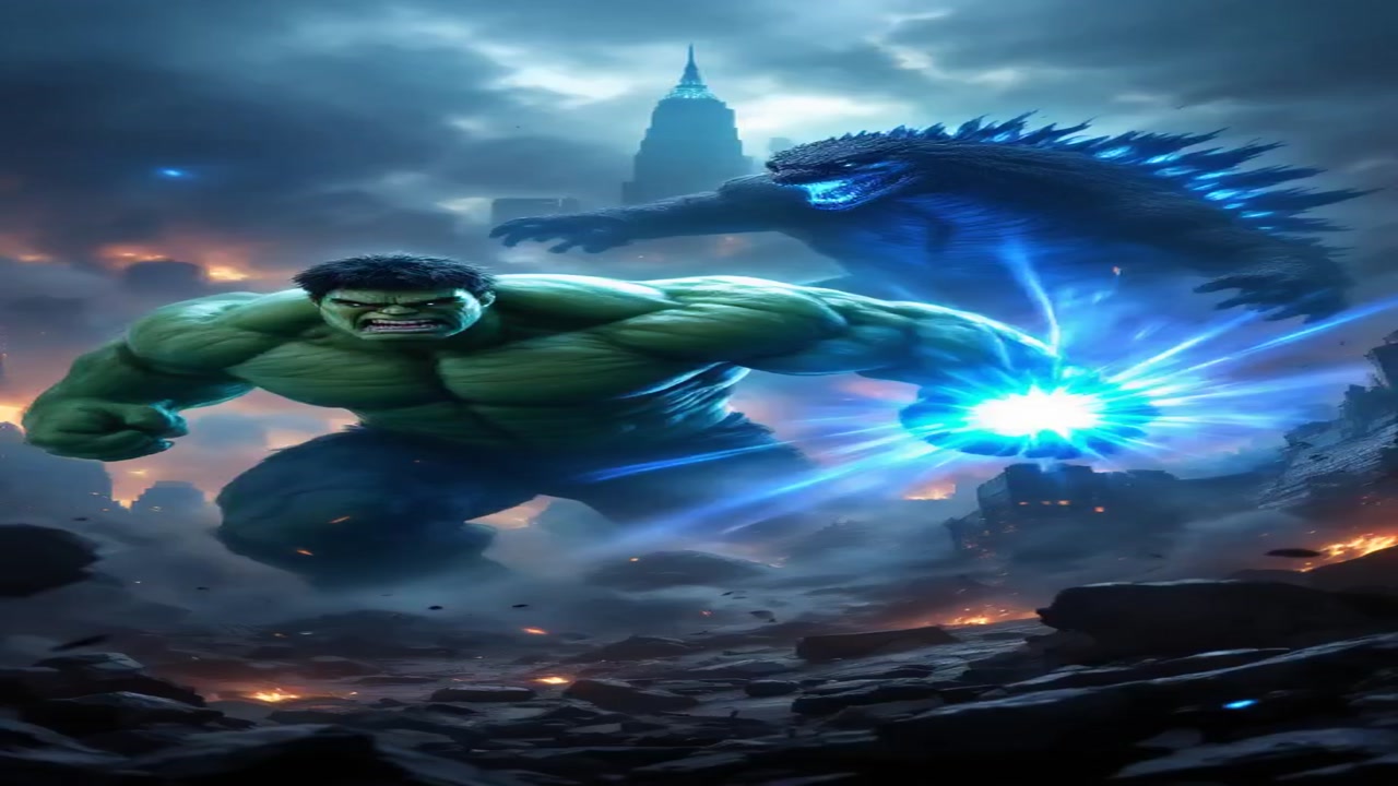 "Hulk vs Godzilla: Epic Battle of Titans in a Crumbling Cityscape!"