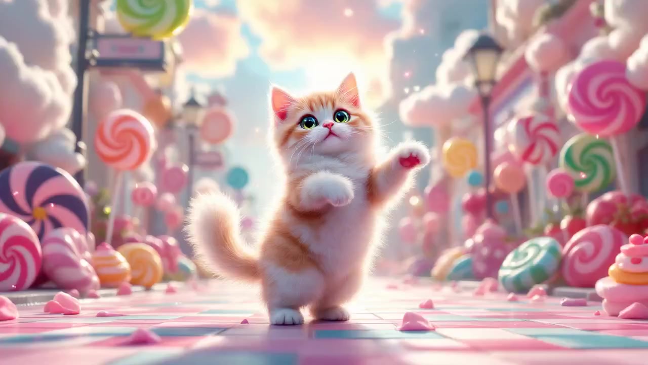 "Whimsical Cat Dance: A Colorful Fantasy Adventure in a Candy-Colored World"