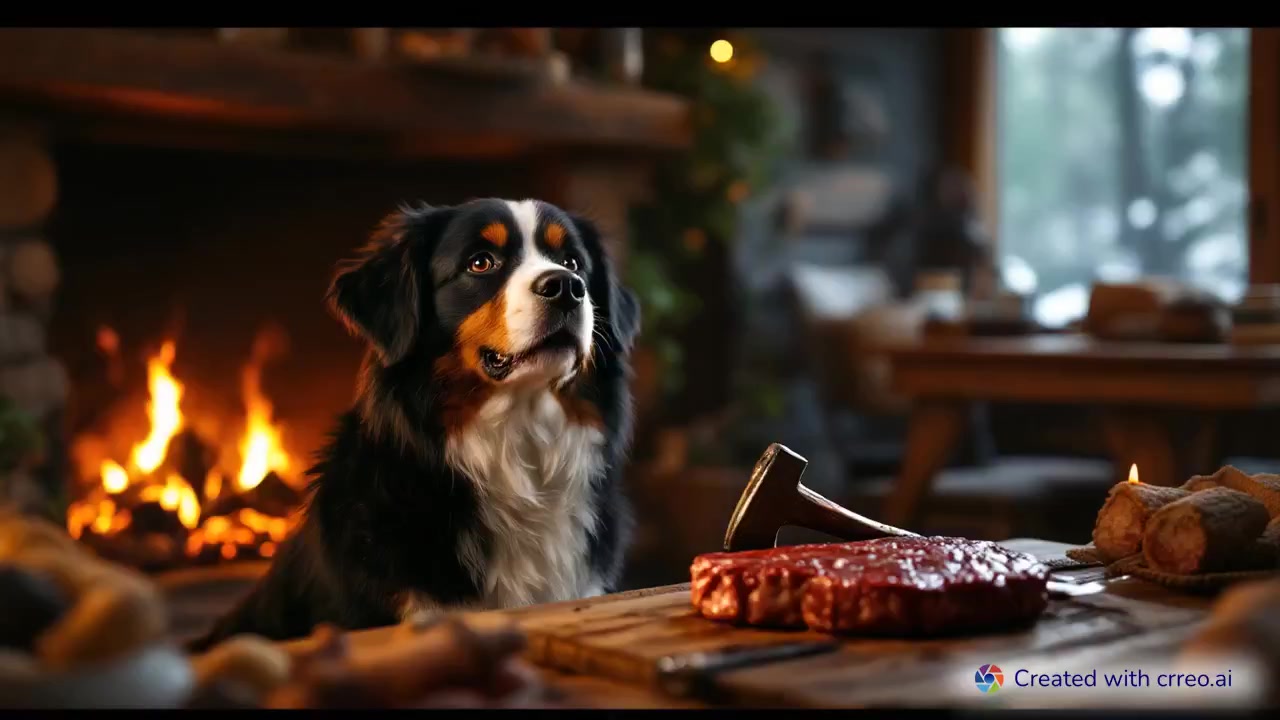 "Cozy Cabin Feast: Bernese Mountain Dog Enjoys a Juicy Tomahawk Steak Delight!"